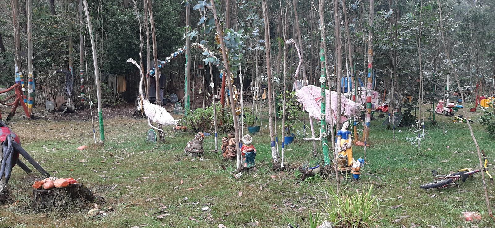 Este jardín es el resultado de años de trabajo personal, donde la creatividad y la imaginación se materializan a través de esculturas realizadas con materiales reciclados, elementos naturales y objetos cotidianos reutilizados.