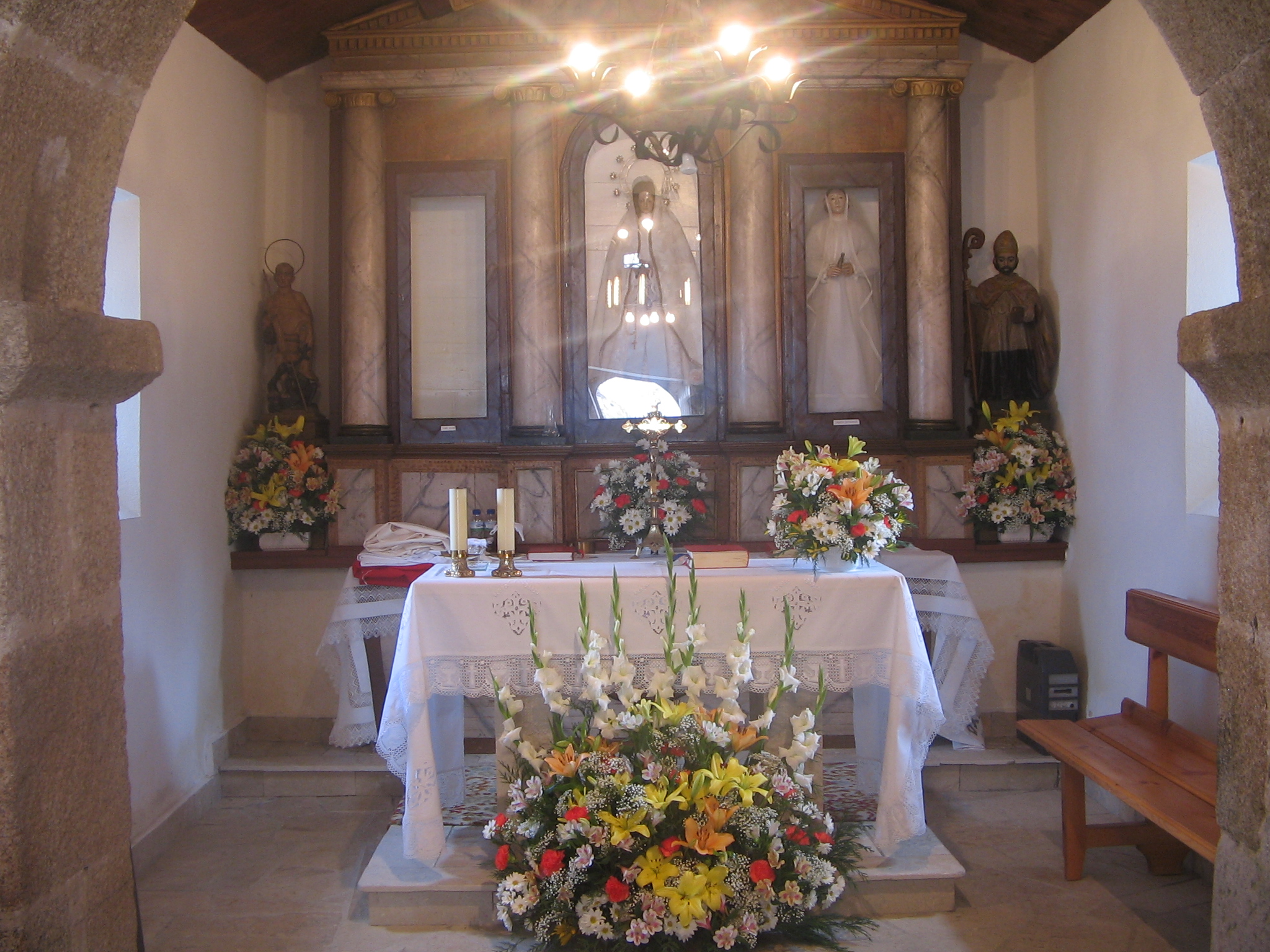 Está edificada con mampostería irregular de pizarra, reforzada por cantería de granito en la portada principal y arco de triunfo. No obstante, la fachada principal está enlucida y pintada. Como es habitual en la arquitectura tapiega, la cubierta exterior es de pizarra, dispuesta a dos aguas, reforzada con teja árabe en la cumbrera. A la Capilla se accede a través de una única portada, abierta en la fachada principal. Es de medio punto, con dovelaje, que apoya en pilares de cantería. Al interior, todos los espacios están cubiertos con armadura de madera, dispuesta a doble agua, aunque originalmente el presbiterio, con toda probabilidad, estaba cubierto con bóveda de cañón.