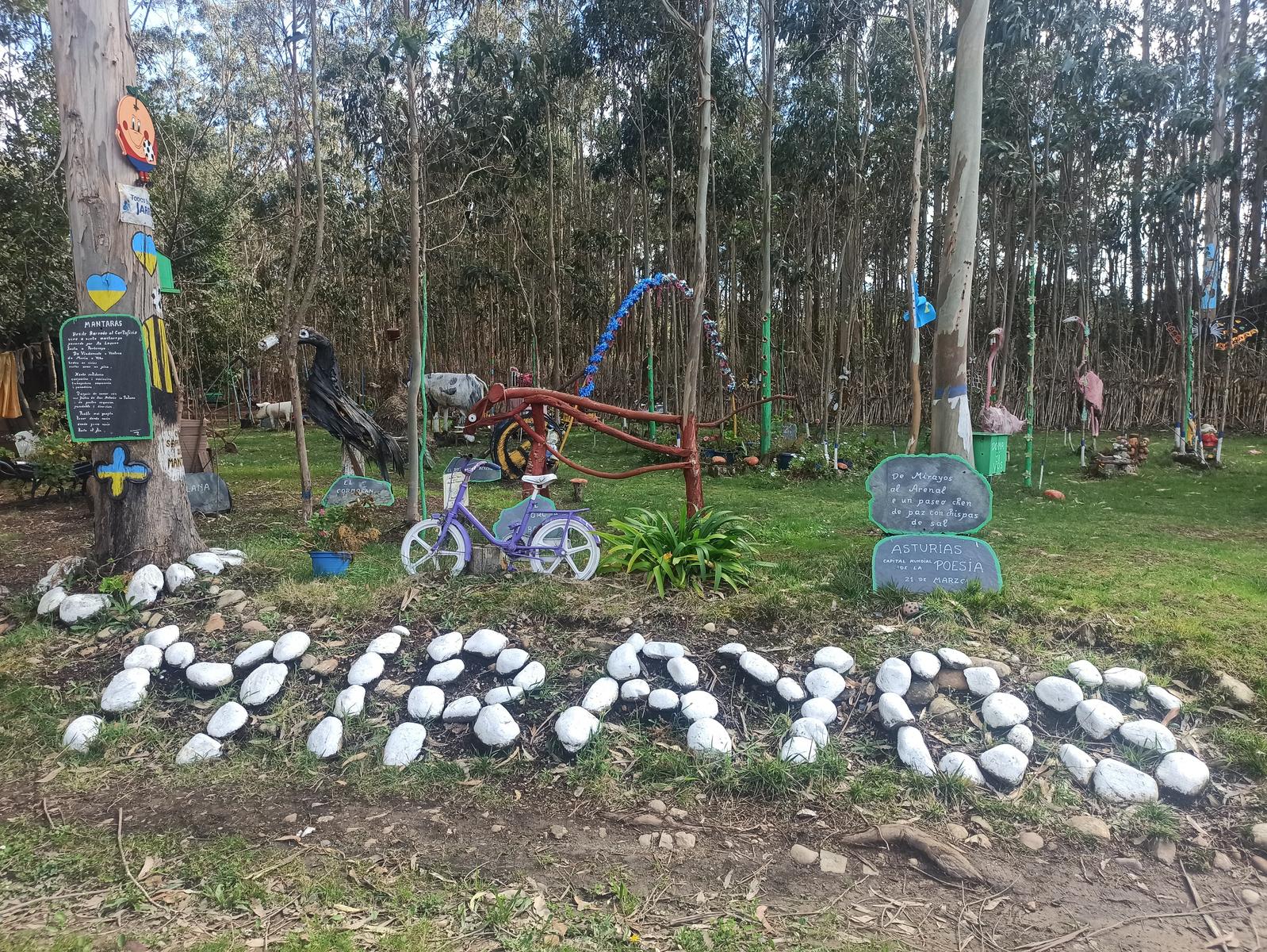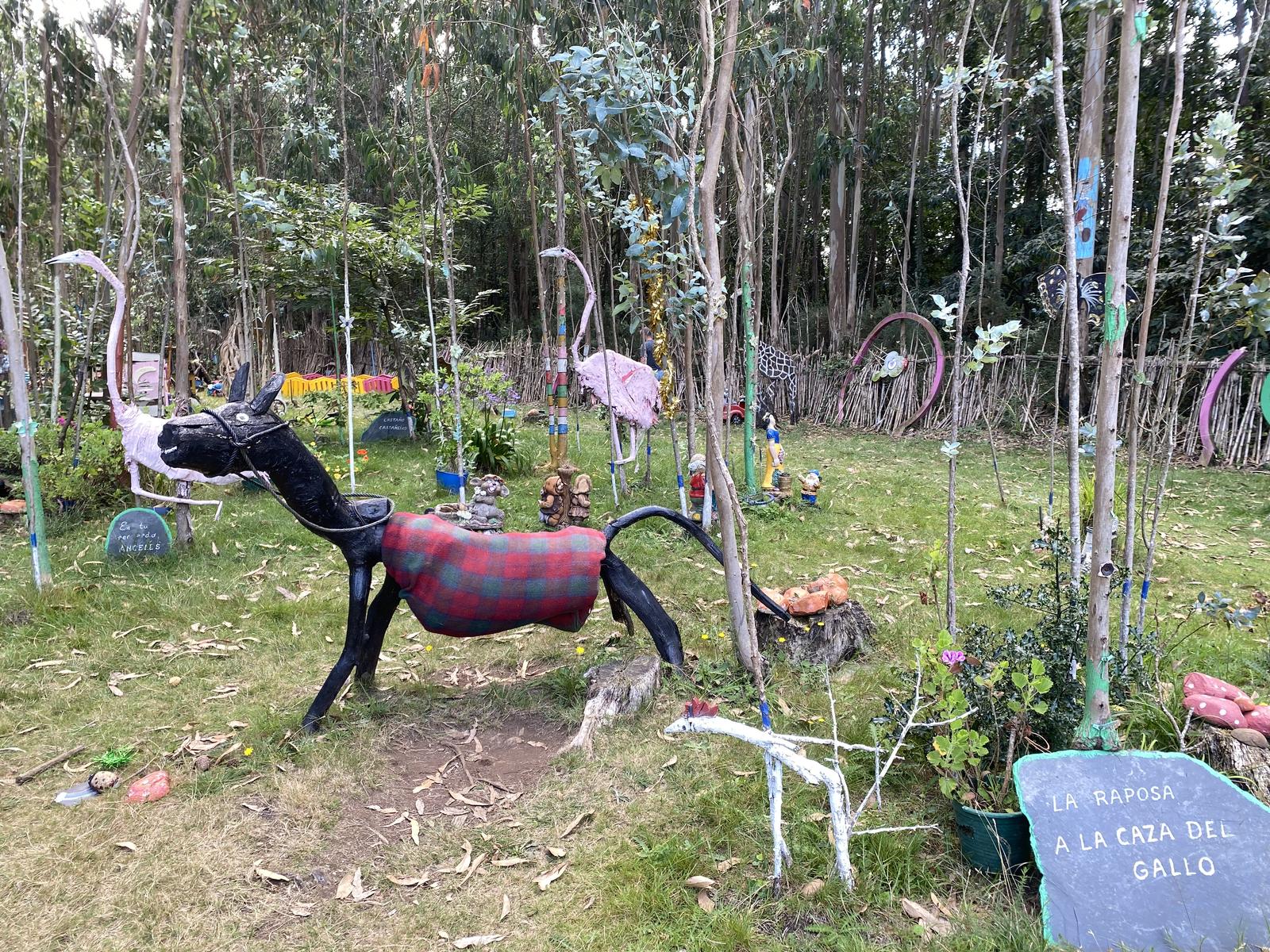 Este jardín es el resultado de años de trabajo personal, donde la creatividad y la imaginación se materializan a través de esculturas realizadas con materiales reciclados, elementos naturales y objetos cotidianos reutilizados.