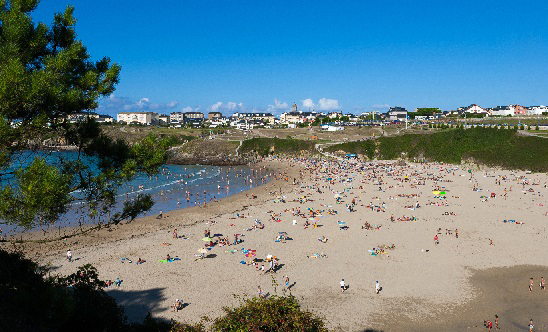 Descripción: Situada en pleno paseo marítimo. Playa urbana, de arena fina dorada y oleaje moderado. Se comunica en marea baja con la playa de las Furadas, Ribeiría y La Grande. Desde 1996, en el mes de agosto se celebra el Festival Intercéltico, declarado de Interés Turístico Regional. Hace pocos años esta playa era muy peculiar por estar protegida una muralla que la cruzaba horizontalmente, de ahí su nombre; hoy forma parte del paseo marítimo, con buenos accesos y servicios.